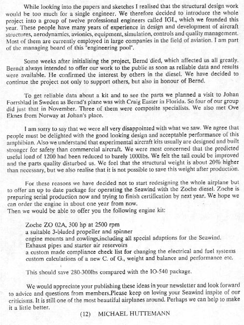 Another zing: the flight test went great. They say that the Lancair and the Glassair have a pitch/stability problem but the Seawind doers not have that problem. You can fly her hands off. The rudder control is very effective with no Dutch roll tendency. She is good in 20 knot crosswinds. Under 50 knot stall speed...what a bird...keep working...keep working...I love this Seawind.